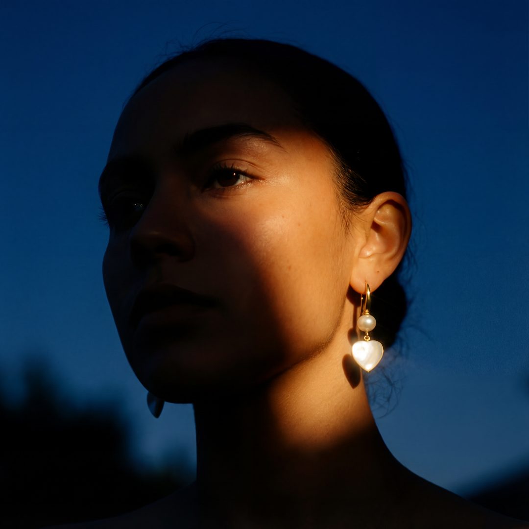 Een zachte parel, een hart van parelmoer en een warme gouden haak. Een echte lichtvanger—moeiteloos van dag naar avond. Met de hand gemaakt in kleine oplage. Omdat elke dag er één is om je te versieren.